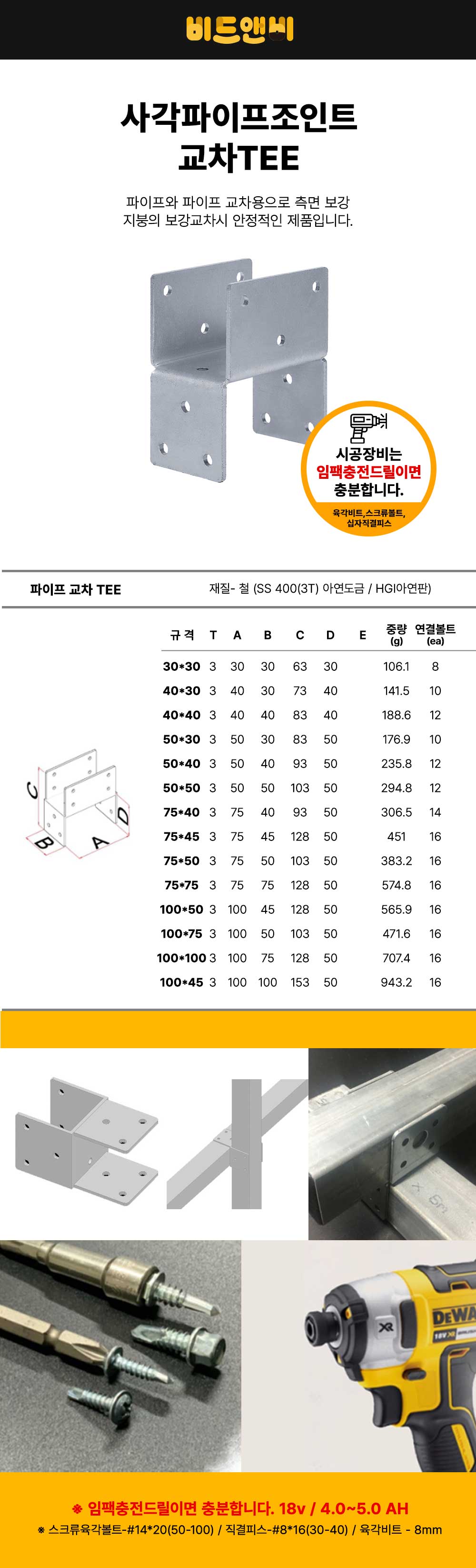 [둑스] 사각파이프조인트 교차TEE 요약정보 및 구매